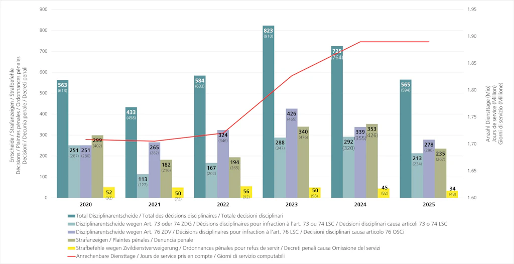 Disziplinarverfahren und Strafbestimmungen ab 2020 — © ZIVI Die Zeiträume 2004-2011 und 2012-2019 in zwei Tabellen unterhalb nachfolgender Erläuterungen. Die Grafik enthält zwei Y-Achsen, auf der linken Y-Achse werden die Disziplinarentscheide, Strafanzeigen und Strafbefehle aufgeführt. Auf der rechten Y-Achse wird mit der roten Linie die Anzahl geleisteter Diensttage in Millionen gezeigt. Für mehr Details zu den Disziplinar- und Strafbestimmungen siehe unter Rechte & Pflichten die Strafbestimmungen und Disziplinarverfahren.