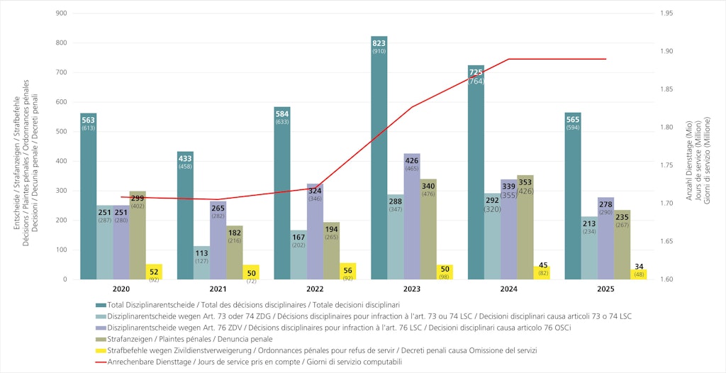 Procédures disciplinaires et sanctions pénales depuis 2020 — © CIVI Les périodes 2004-2011 et 2012-2019 sont représentées dans les deux tableaux qui suivent. Le graphique présente deux échelles sur l’axe des ordonnées. Celle de gauche indique les décisions disciplinaires, les plaintes pénales et les ordonnances pénales ; celle de droite, le nombre de jours de service accomplis, en millions (ligne rouge). Des informations plus détaillées au sujet des sanctions disciplinaires et pénales se trouvent sur la page Droits et obligations.