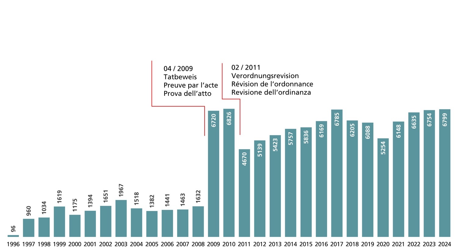 Les statistiques menées depuis 2004 ont pu être affinées à plusieurs reprises, grâce au développement des systèmes de contrôle de gestion en 2012 et en 2020. Les chiffres présentés couvrent donc trois périodes distinctes. La période qui débute en 2020 est illustrée par le graphique.