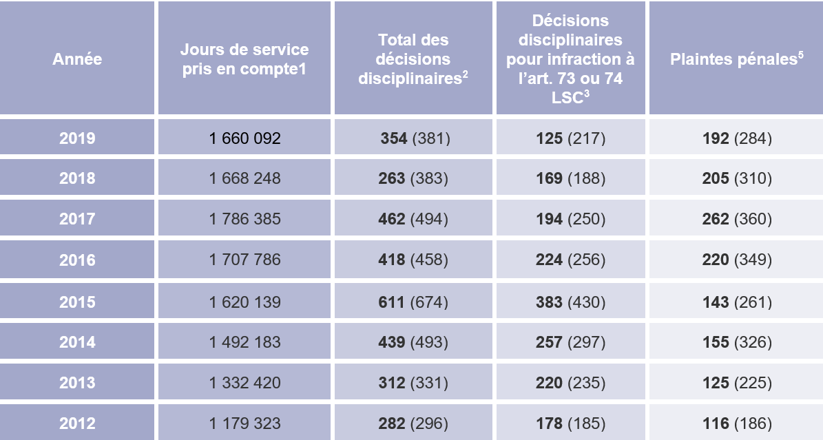 - Nombre de décisions disciplinaires rendues dans l’année civile pour infraction à l’art. 76 OSCi (règles relatives à l’annonce de maladies et à la fourniture d’un certificat médical), comprises dans le total des décisions disciplinaires, et nombre de manquements faisant l’objet des décisions (entre parenthèses).