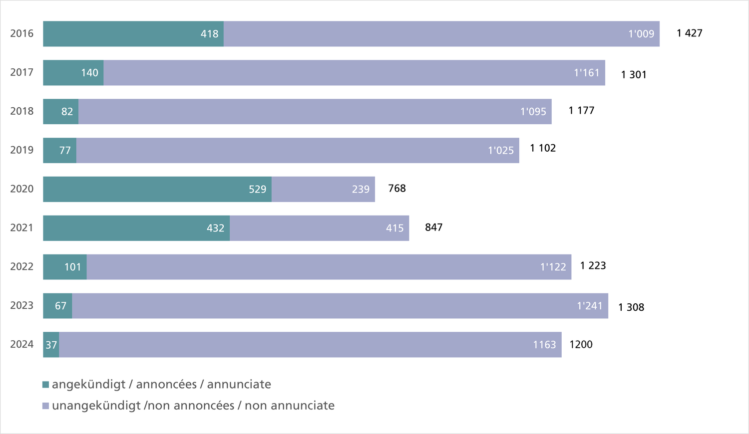 - Nombre de plaintes pénales déposées dans l’année civile auprès des services cantonaux et nombre de manquements faisant l’objet des plaintes (entre parenthèses). Ces ordonnances peuvent concerner des manquements commis l’année précédente. Une plainte pénale peut porter sur plusieurs manquements, p. ex. des insoumissions répétées.