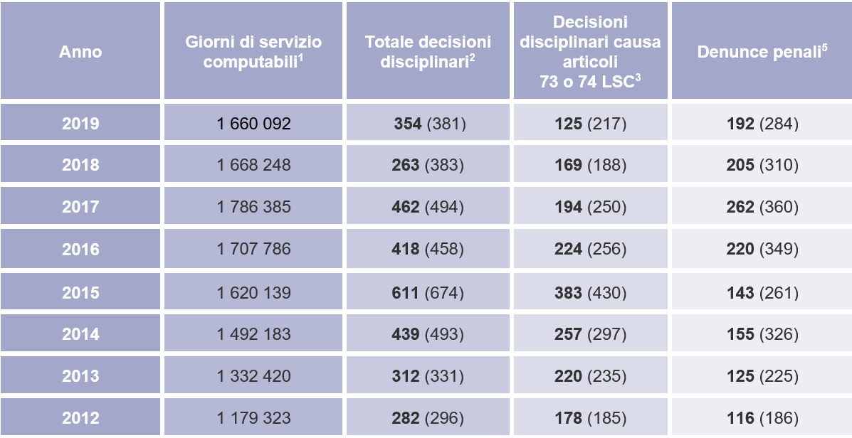 - Numero di decisioni disciplinari (conteggiate all'interno del «Totale decisioni disciplinari») disposte nel corso dell'anno civile per caso non grave di omissione del servizio (art. 73 LSC) o per caso non grave di omissione del servizio per negligenza (art. 74 LSC) nonché numero delle violazioni degli obblighi già valutate (tra parentesi).